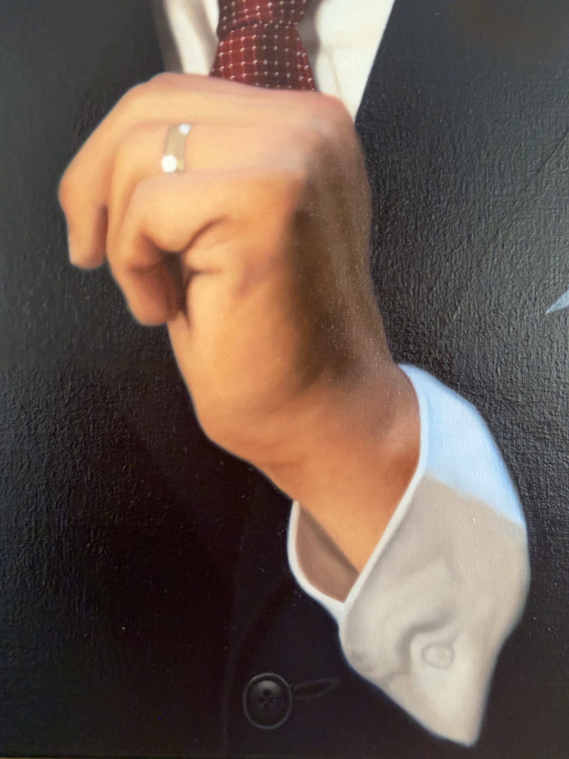Desde una dimensión psicológica, la obra construye una narrativa de confianza y determinación. La expresión del retratado, con una mirada franca y una media sonrisa afable, sugiere una personalidad accesible pero firme, propia de quien ejerce el liderazgo con seguridad. El gesto de la mano alzada, en una posición que denota acción contenida o énfasis retórico, añade un dinamismo sutil a la pose, simbolizando compromiso y fuerza de voluntad. El artista ha logrado trascender la apariencia física para plasmar un carácter que proyecta tanto experiencia como vitalidad política.