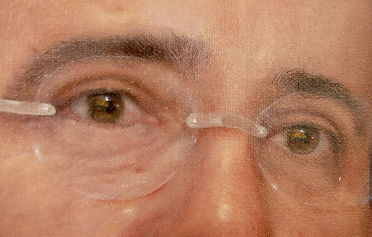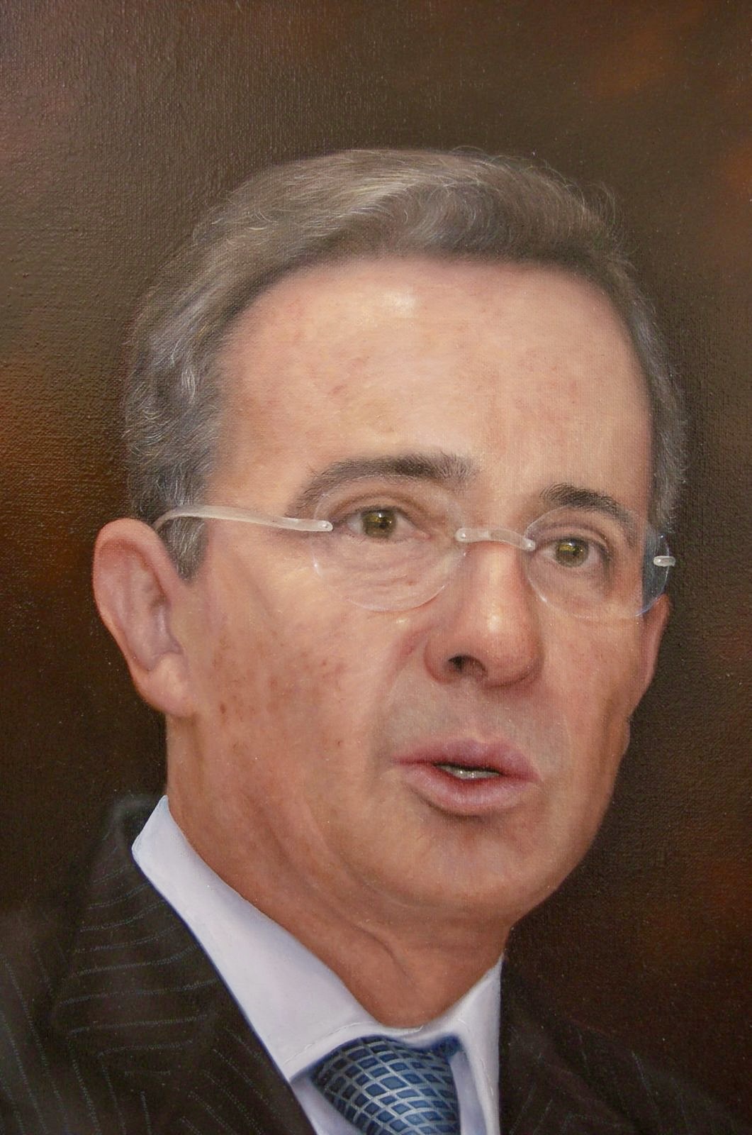 En este lienzo de notable contundencia visual, el maestro Sergio González aborda la figura de Álvaro Uribe Vélez con un realismo que no admite ambigüedades. La obra se construye a partir de una iluminación dirigida y precisa, que modela la anatomía facial con un rigor casi arquitectónico; la luz incide sobre la frente y los pómulos para resaltar la tensión y la energía contenida de un rostro habituado a la toma de decisiones críticas, otorgando a la piel una verosimilitud orgánica que respira bajo el óleo y revela el paso del tiempo como un mapa de experiencia política.