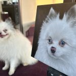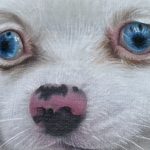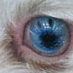 En cuanto a la composición y el tratamiento matérico, la pieza exhibe un equilibrio solemne, apoyado en un fondo neutro y oscuro que, siguiendo la tradición del retrato clásico, concentra toda la atención en la luminosidad de la figura. La pincelada es de una meticulosidad exquisita, particularmente visible en la resolución de la textura del pelaje; cada mechón blanco ha sido trabajado para transmitir una sensación táctil de suavidad y ligereza, contrastando magistralmente con la humedad y el brillo vívido de la nariz, detallada en sus tonos rosados y negros. La armonía cromática es sobria pero impactante, donde los blancos puros y los grises perla del manto sirven de marco perfecto para el azul profundo y cristalino de los ojos, creando un punto focal de gran magnetismo.