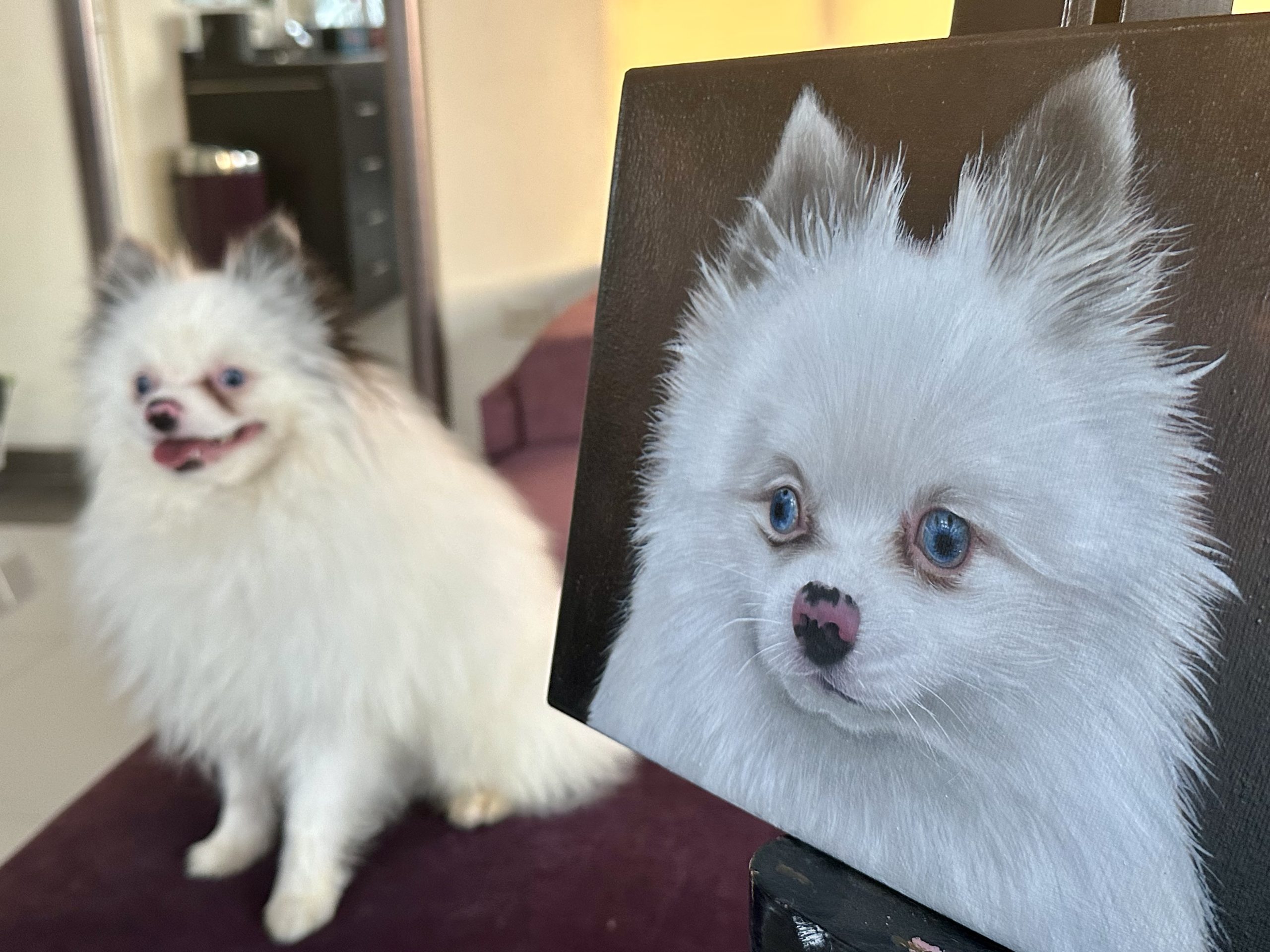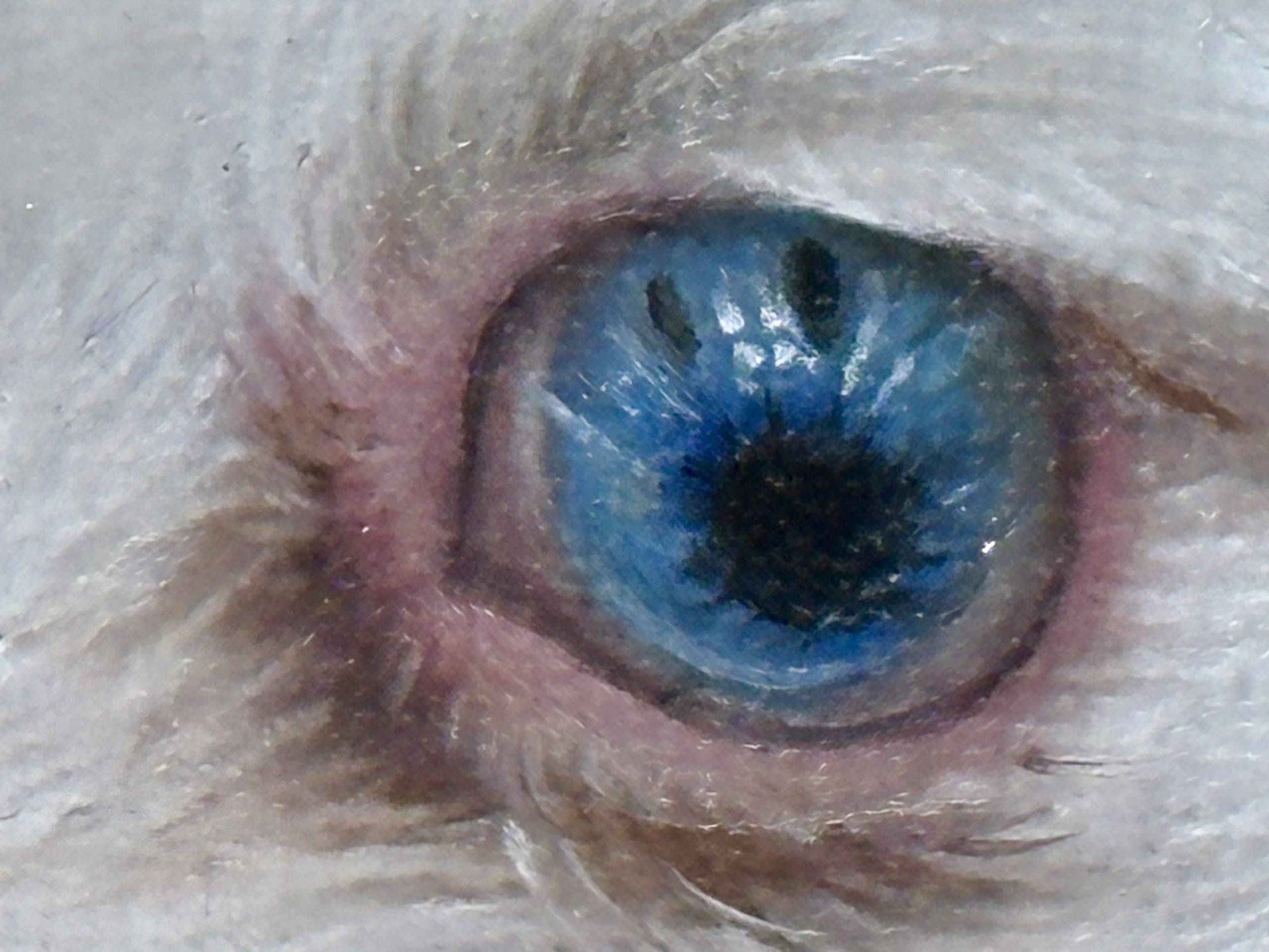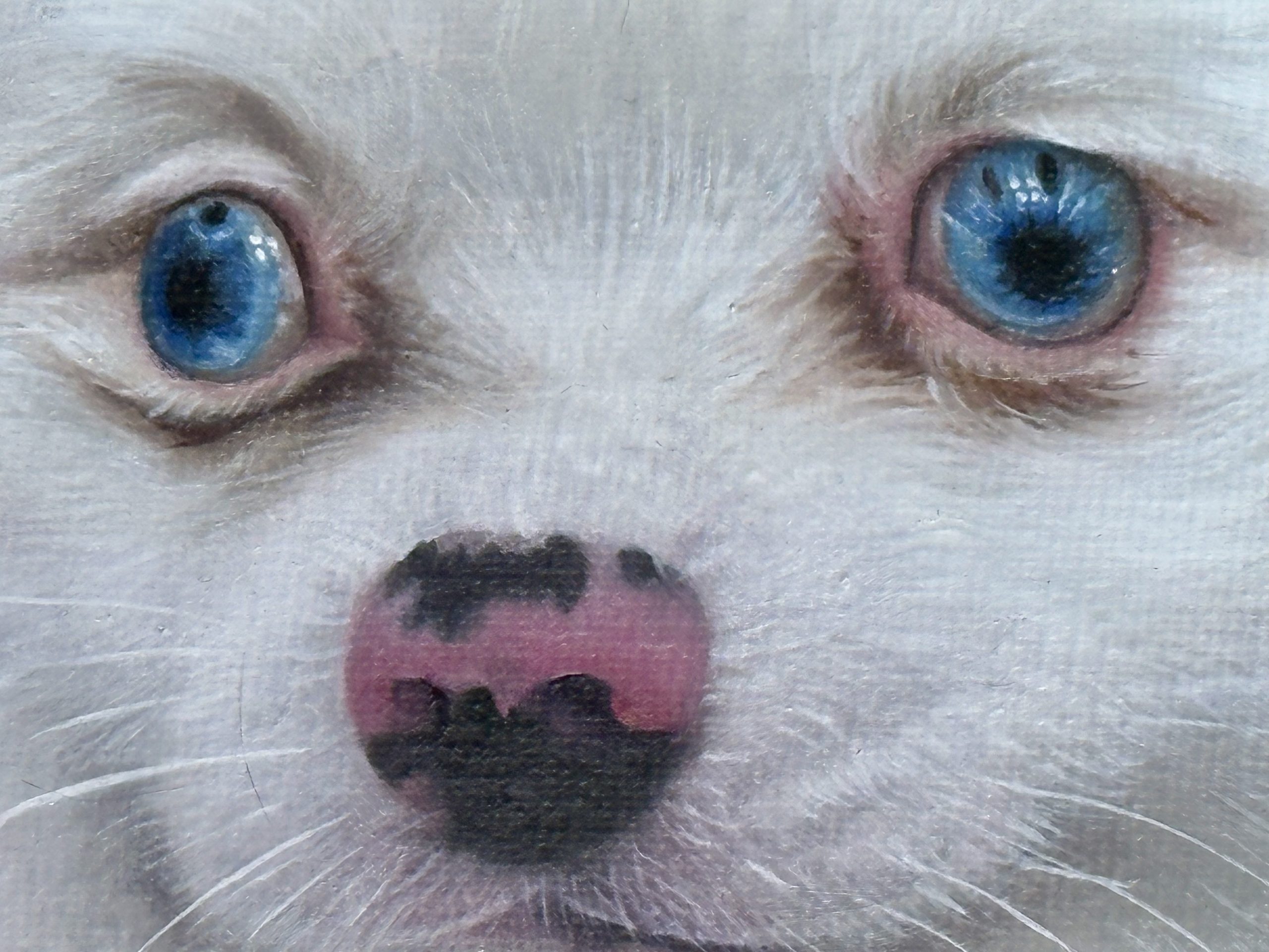En cuanto a la composición y el tratamiento matérico, la pieza exhibe un equilibrio solemne, apoyado en un fondo neutro y oscuro que, siguiendo la tradición del retrato clásico, concentra toda la atención en la luminosidad de la figura. La pincelada es de una meticulosidad exquisita, particularmente visible en la resolución de la textura del pelaje; cada mechón blanco ha sido trabajado para transmitir una sensación táctil de suavidad y ligereza, contrastando magistralmente con la humedad y el brillo vívido de la nariz, detallada en sus tonos rosados y negros. La armonía cromática es sobria pero impactante, donde los blancos puros y los grises perla del manto sirven de marco perfecto para el azul profundo y cristalino de los ojos, creando un punto focal de gran magnetismo.
