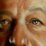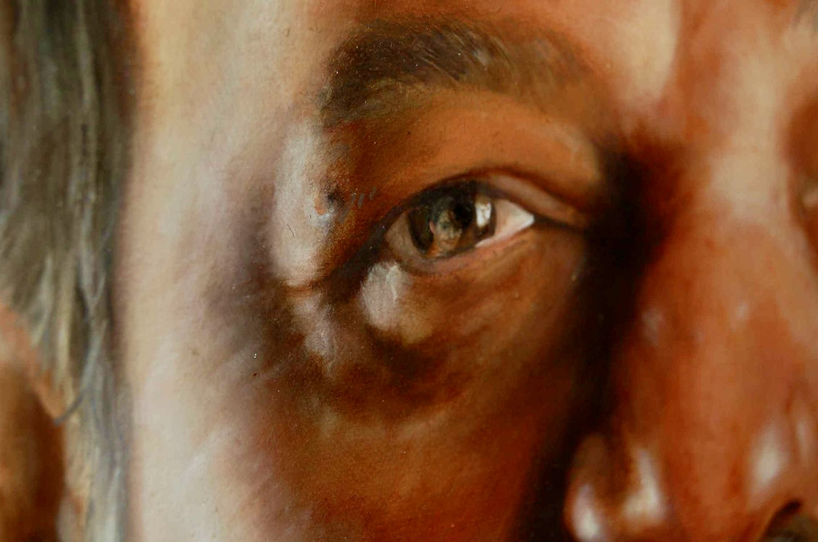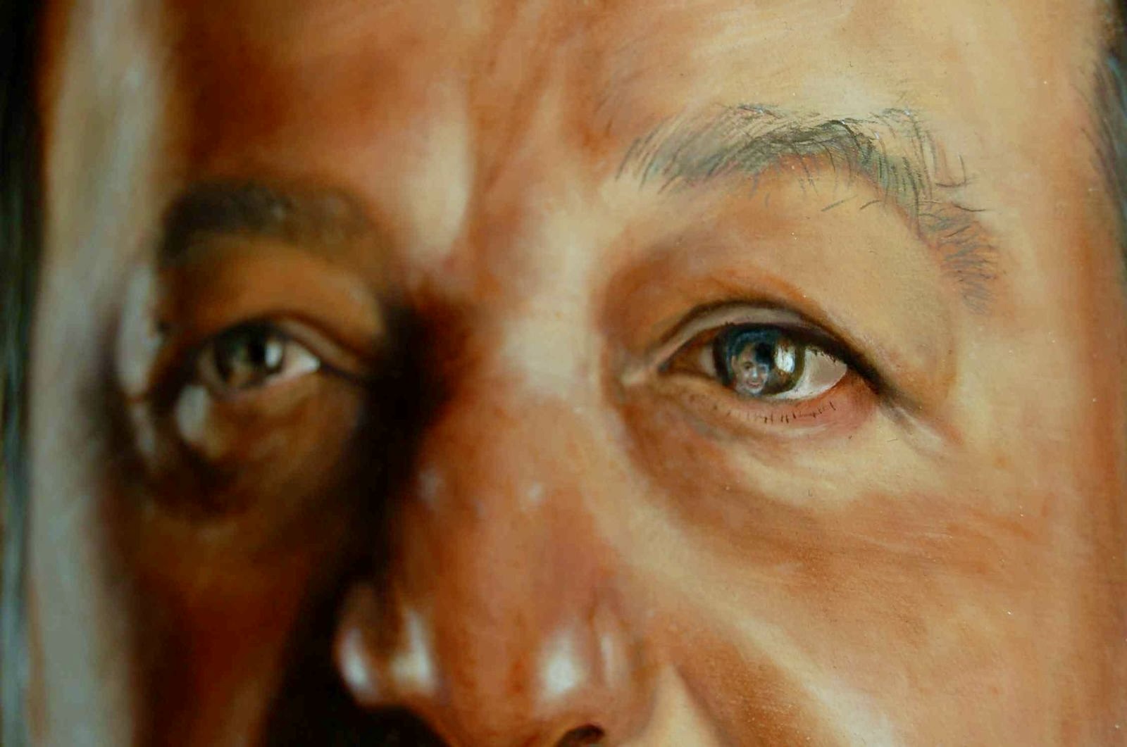 En su dimensión psicológica, el retrato articula la dualidad entre el hombre público y el ser humano sensible. La expresión de Carlos Slim es de una firmeza serena, propia de un liderazgo consolidado, pero la inclusión del reflejo de su esposa en el iris transforma la lectura de su mirada: ya no es solo la vista de un empresario hacia el horizonte, sino la visión de un hombre que lleva consigo, de manera indeleble, la memoria de su compañera. Esta decisión simbólica suaviza la autoridad del personaje, revelando una lealtad emocional que humaniza profundamente la figura, presentándolo como alguien cuya percepción del mundo está mediada por el recuerdo del amor.