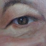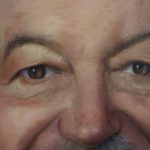 La composición se centra en un acercamiento extremo, un primerísimo primer plano que obliga al espectador a confrontar la mirada del protagonista sin distracciones. La destreza de González en el manejo de la textura es absoluta; desde la incipiente barba cana hasta la humedad vítrea del globo ocular, la pincelada se vuelve invisible para dar paso a la materia viva. Sin embargo, el elemento que consagra la genialidad compositiva de esta pieza es un detalle microscópico y sublime: en la profundidad oscura de la pupila de Slim, se encuentra pintado el reflejo nítido de su difunta esposa, Soumaya Domit. Este hallazgo técnico no solo demuestra una precisión de orfebre, sino que altera la armonía cromática al introducir la figura de ella como un punto de luz espiritual dentro de la mirada terrenal de él.