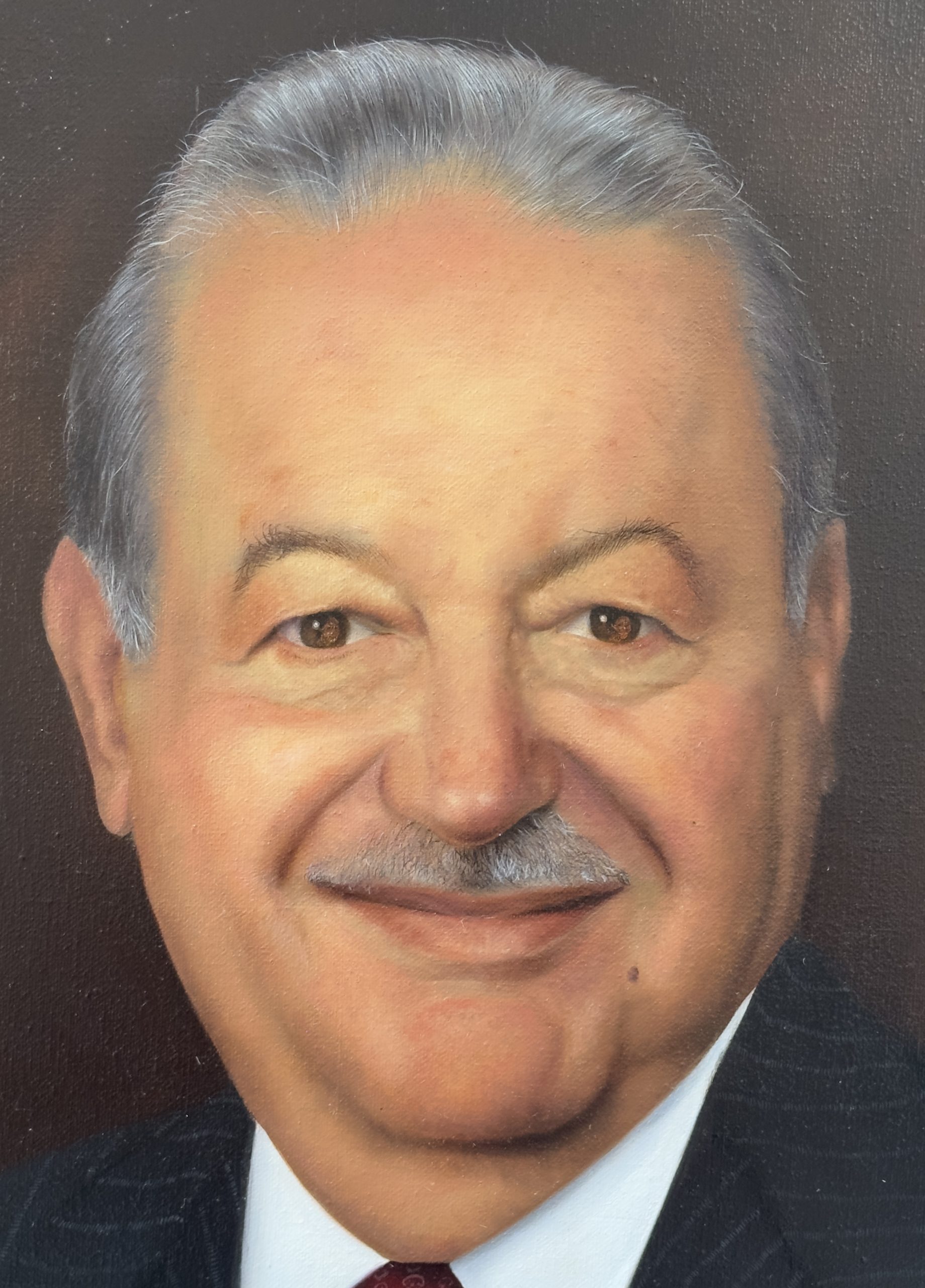 En el exigente ámbito del arte figurativo contemporáneo, este retrato íntimo ejecutado por el maestro Sergio González se revela como una cumbre del detalle y la narrativa emocional. La obra aborda la efigie del ingeniero Carlos Slim Helú con un realismo técnico que roza el virtuosismo, donde la luz no se limita a iluminar, sino que explora la geografía del rostro con una honestidad brutal y conmovedora. El artista ha logrado capturar la translucidez de la piel y los matices cromáticos de la edad, modelando cada pliegue y cada poro con una naturalidad que dota al sujeto de una respiración casi perceptible, afirmando la capacidad de la pintura para rivalizar con la lente fotográfica en precisión, pero superándola en calidez humana.