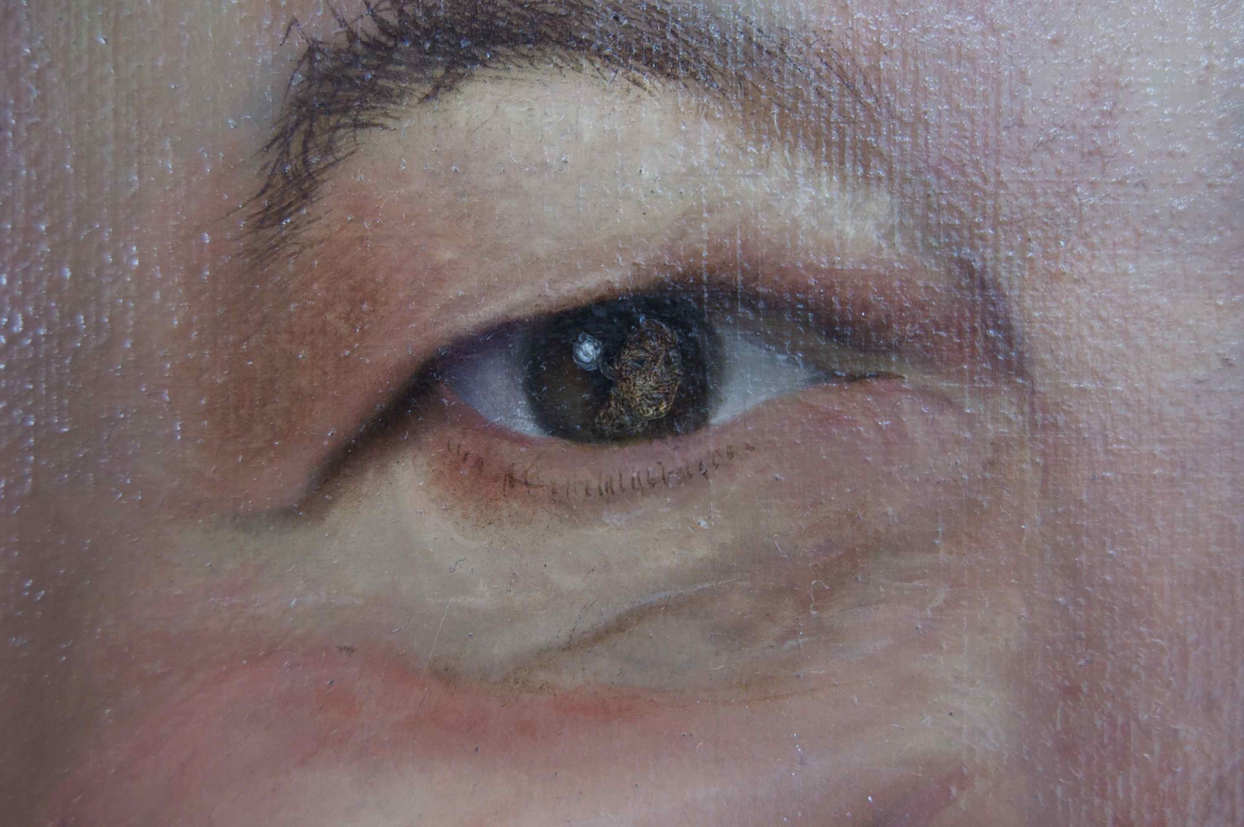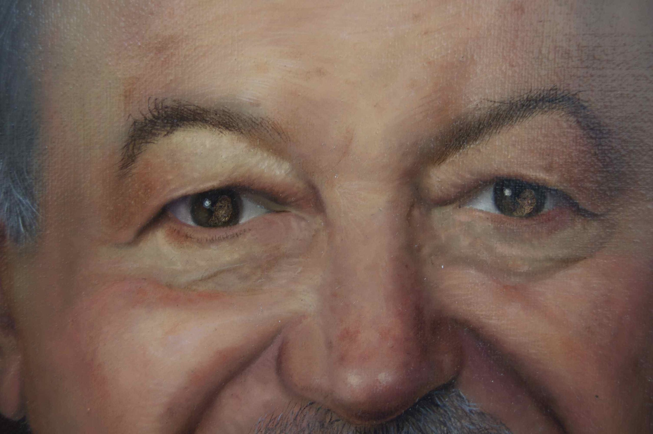 La composición se centra en un acercamiento extremo, un primerísimo primer plano que obliga al espectador a confrontar la mirada del protagonista sin distracciones. La destreza de González en el manejo de la textura es absoluta; desde la incipiente barba cana hasta la humedad vítrea del globo ocular, la pincelada se vuelve invisible para dar paso a la materia viva. Sin embargo, el elemento que consagra la genialidad compositiva de esta pieza es un detalle microscópico y sublime: en la profundidad oscura de la pupila de Slim, se encuentra pintado el reflejo nítido de su difunta esposa, Soumaya Domit. Este hallazgo técnico no solo demuestra una precisión de orfebre, sino que altera la armonía cromática al introducir la figura de ella como un punto de luz espiritual dentro de la mirada terrenal de él.