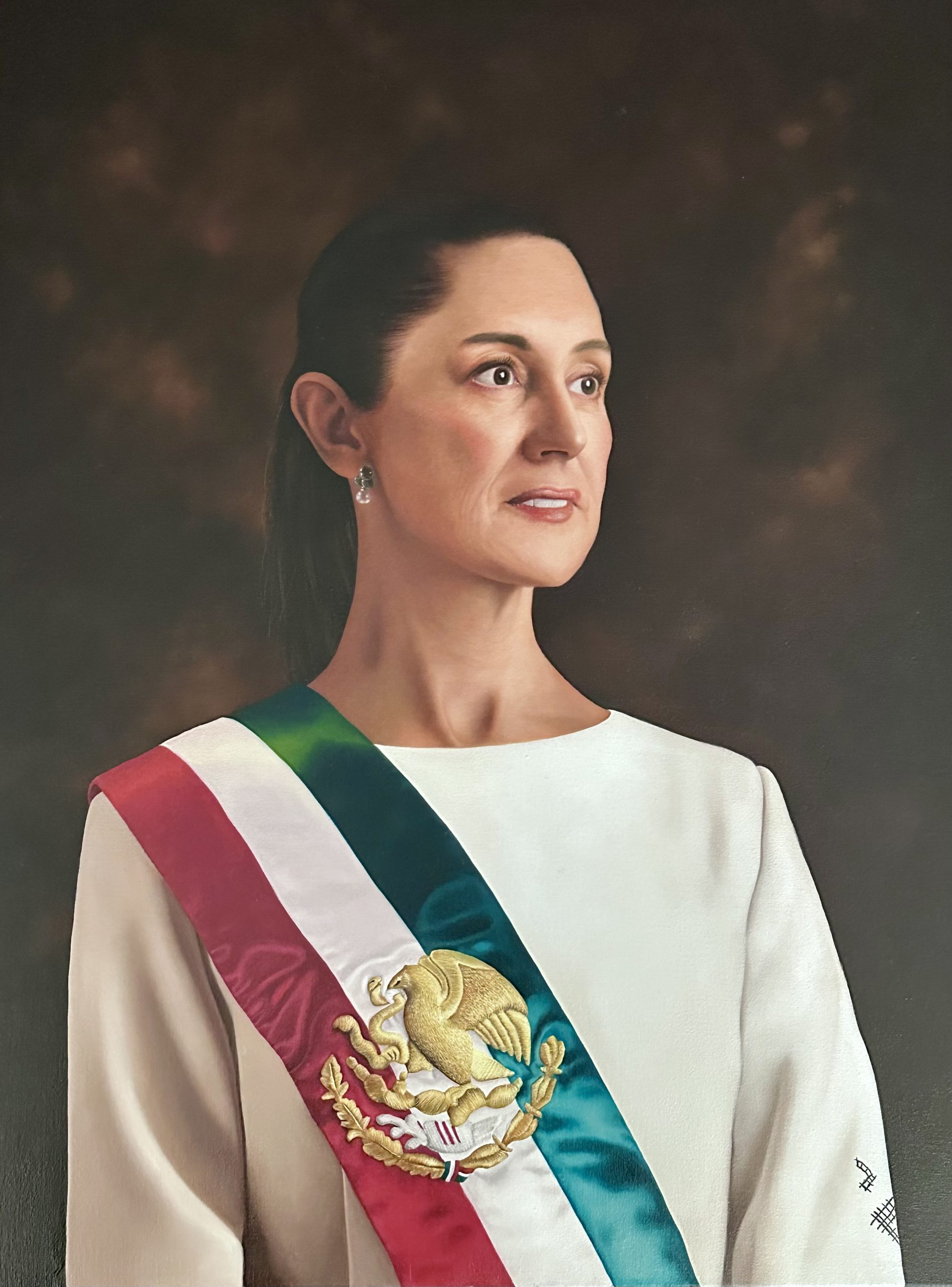 En conclusión, este lienzo reafirma la maestría artística de Sergio González y su capacidad para ejecutar el retrato oficial con una sensibilidad moderna que respeta la solemnidad del género. La pieza se erige como un documento histórico de alto valor estético, donde la técnica depurada se pone al servicio de la representación del poder democrático. Es un testimonio visual que perdurará en el tiempo, encapsulando la identidad de la primera mujer presidenta de México con una elegancia y una veracidad técnica dignas de admiración.