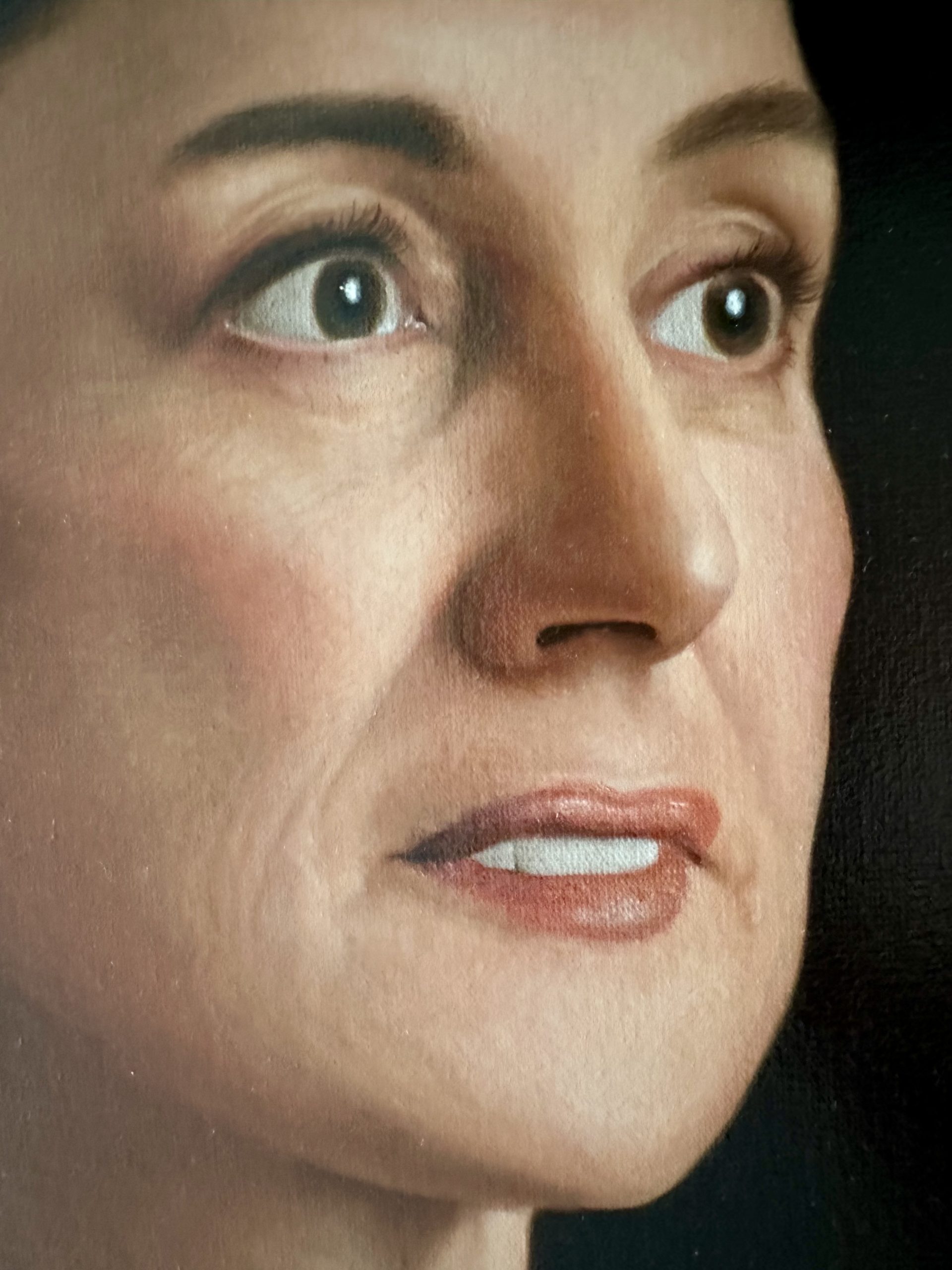 En el panorama del arte figurativo contemporáneo, este retrato institucional realizado por el maestro Sergio González se destaca como una obra de notable rigor técnico y profundidad expresiva. La pintura captura la figura de la Presidenta Claudia Sheinbaum Pardo con un realismo que trasciende la mera copia fotográfica, utilizando una iluminación de estudio suave que modela las facciones con delicadeza; la luz acaricia el rostro revelando la estructura ósea y la textura natural de la piel, otorgando a la imagen una vitalidad palpable y una presencia casi tridimensional que es característica de la mejor tradición del retrato de estado.