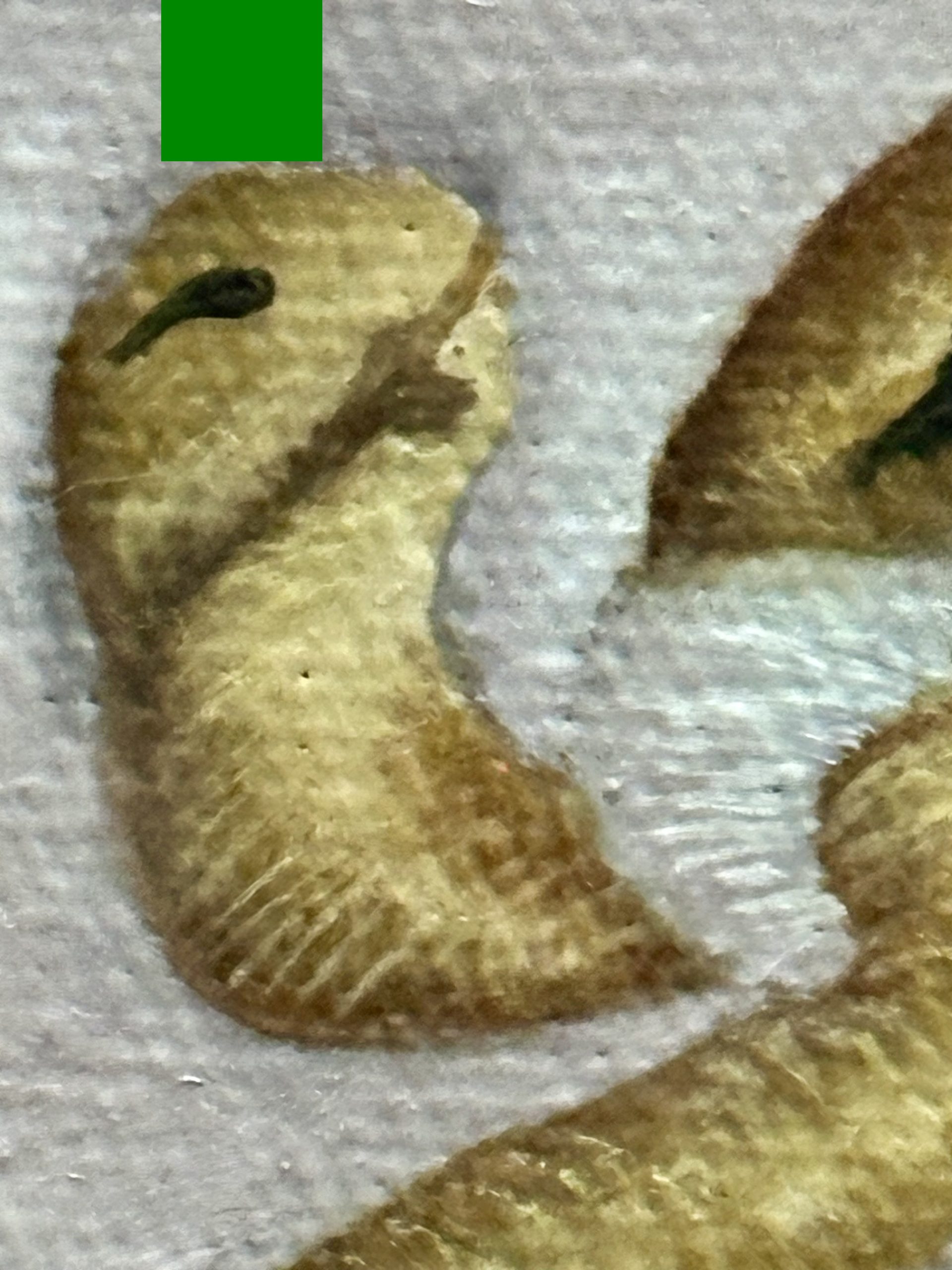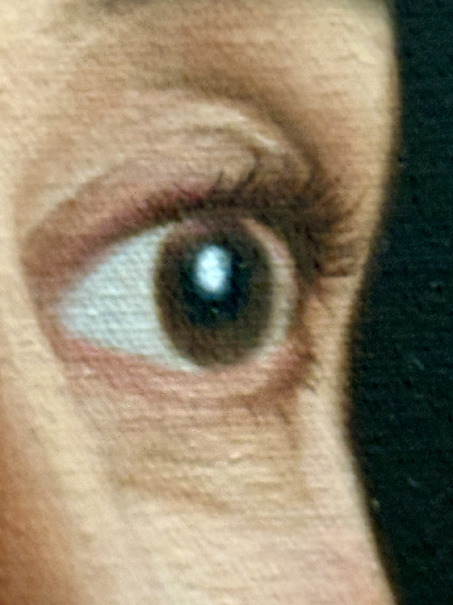 La composición se sostiene sobre un equilibrio solemne y clásico, donde el sujeto se presenta de tres cuartos sobre un fondo neutro de matices oscuros y terrosos, un recurso que remite a los grandes maestros y que sirve para resaltar la luminosidad de la figura central. La armonía cromática es elegante y sobria: la impoluta vestimenta blanca contrasta magníficamente con la penumbra del fondo, mientras que la Banda Presidencial introduce un acento de color vibrante y simbólico. González demuestra una destreza meticulosa en la textura, diferenciando magistralmente la suavidad de la tela del vestido, el brillo satinado de la banda tricolor y, muy especialmente, el relieve dorado del escudo nacional bordado, que captura la luz con un detallismo de orfebre.