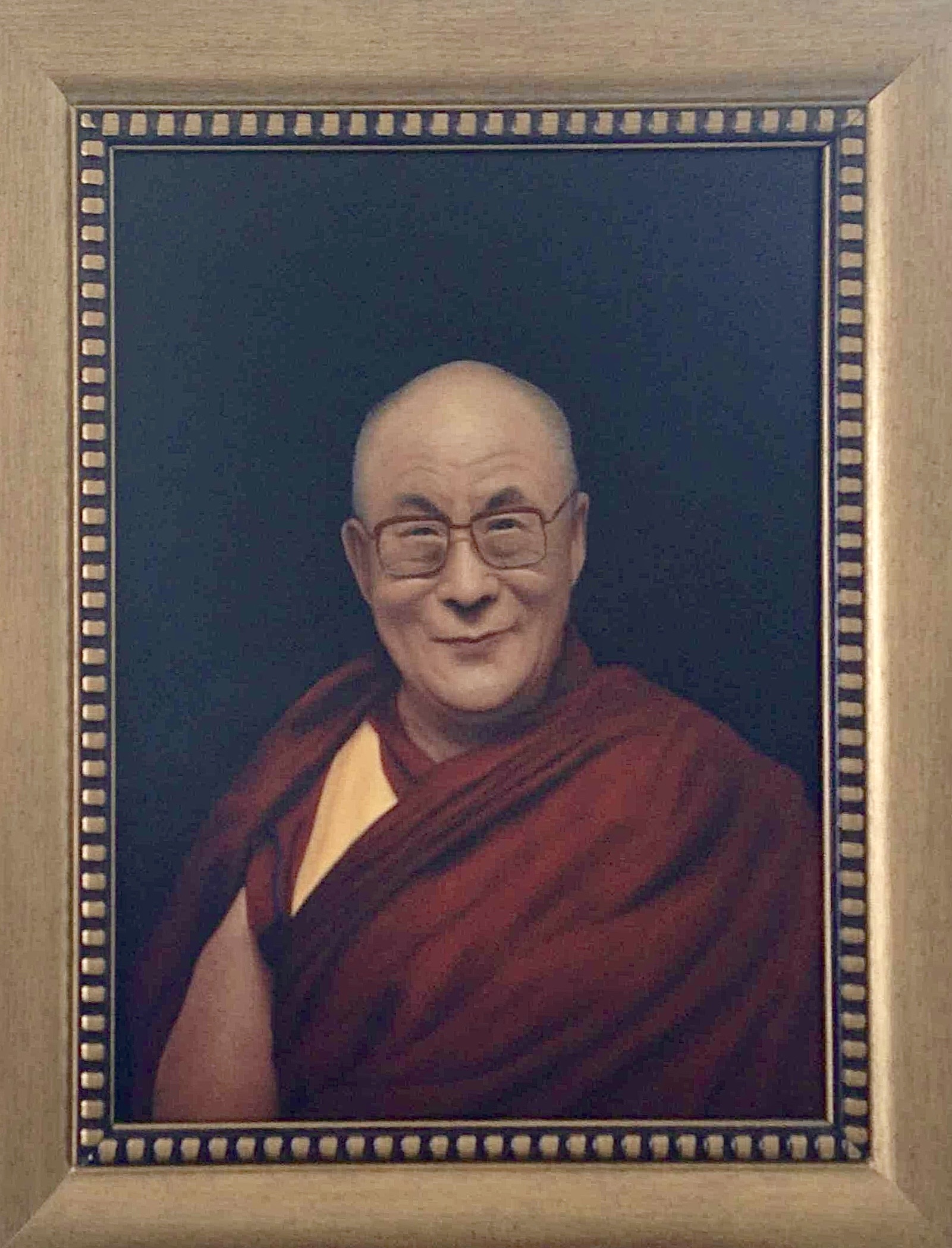 Más allá de la verosimilitud física, la obra profundiza en la dimensión psicológica del líder espiritual. La expresión capturada es de una serenidad benévola y una sabiduría accesible; una leve sonrisa se dibuja en sus labios, transmitiendo la compasión y la firmeza suave que caracterizan su liderazgo mundial. El artista ha logrado destilar la esencia de un hombre que, pese a cargar con la historia de un pueblo y una filosofía milenaria, se presenta con una humanidad desarmante. Es una representación que habla de paz interior y conciencia, transformando el lienzo en un espejo de un carácter que trasciende la representación meramente anatómica.