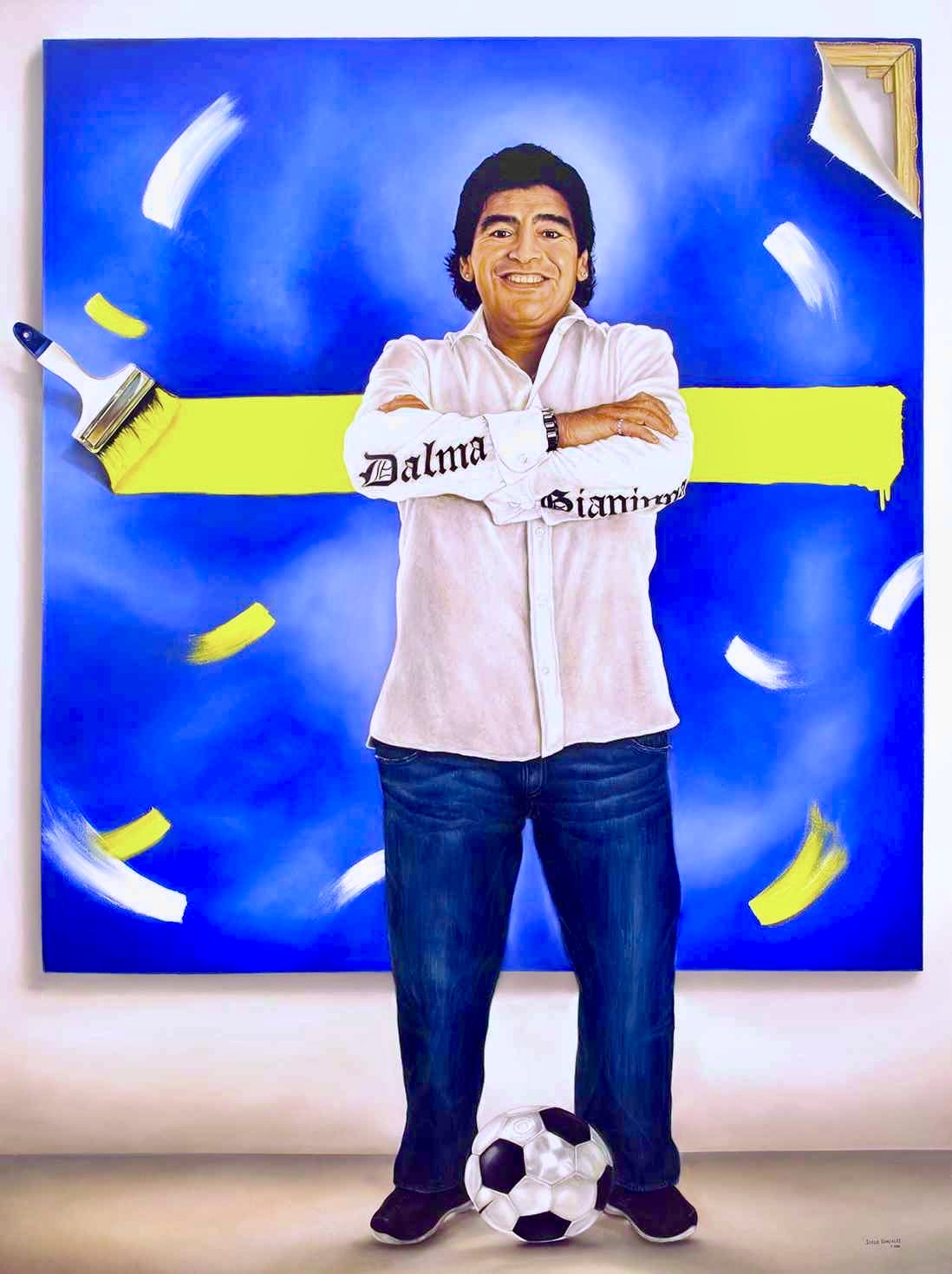 La figura de Diego Armando Maradona irrumpe en el lienzo con una potencia telúrica, capturada magistralmente por el pincel de Sergio González. En esta obra, el realismo contemporáneo se enfrenta al desafío de retratar no solo a un hombre, sino a un mito viviente; el artista resuelve el reto mediante un manejo de la iluminación dramático y vibrante, que esculpe las facciones del «Pelusa» con una intensidad que evoca los claroscuros de los maestros barrocos. La luz no es estática, sino que parece palpitar sobre la piel, acentuando la estructura ósea y la textura vital de un rostro que ha vivido mil vidas en una sola, otorgándole una presencia física abrumadora.