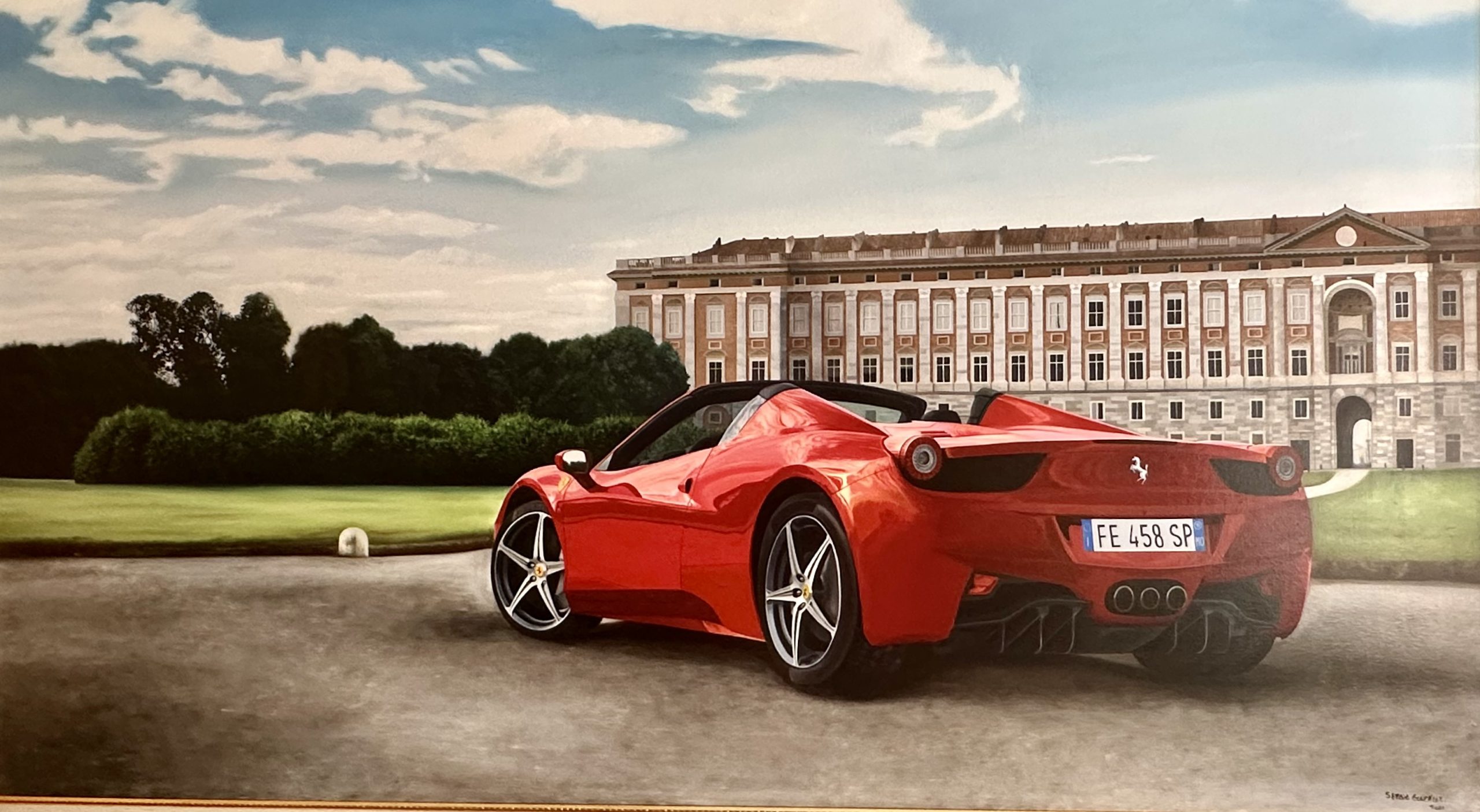 Desde una dimensión psicológica y simbólica, esta vista posterior del automóvil proyecta una narrativa de despedida y potencia latente. A diferencia de la vista frontal que confronta, el ángulo trasero sugiere movimiento, fuga y libertad; es la imagen de la velocidad que deja atrás el pasado estático representado por el edificio. La matrícula visible, «FE 458 SP», actúa como una cédula de identidad que reafirma la exclusividad del modelo, mientras que las luces traseras redondas evocan una mirada atenta y tecnológica. La obra transmite un estatus de nobleza contemporánea, equiparando la maravilla mecánica con la grandeza aristocrática del fondo.