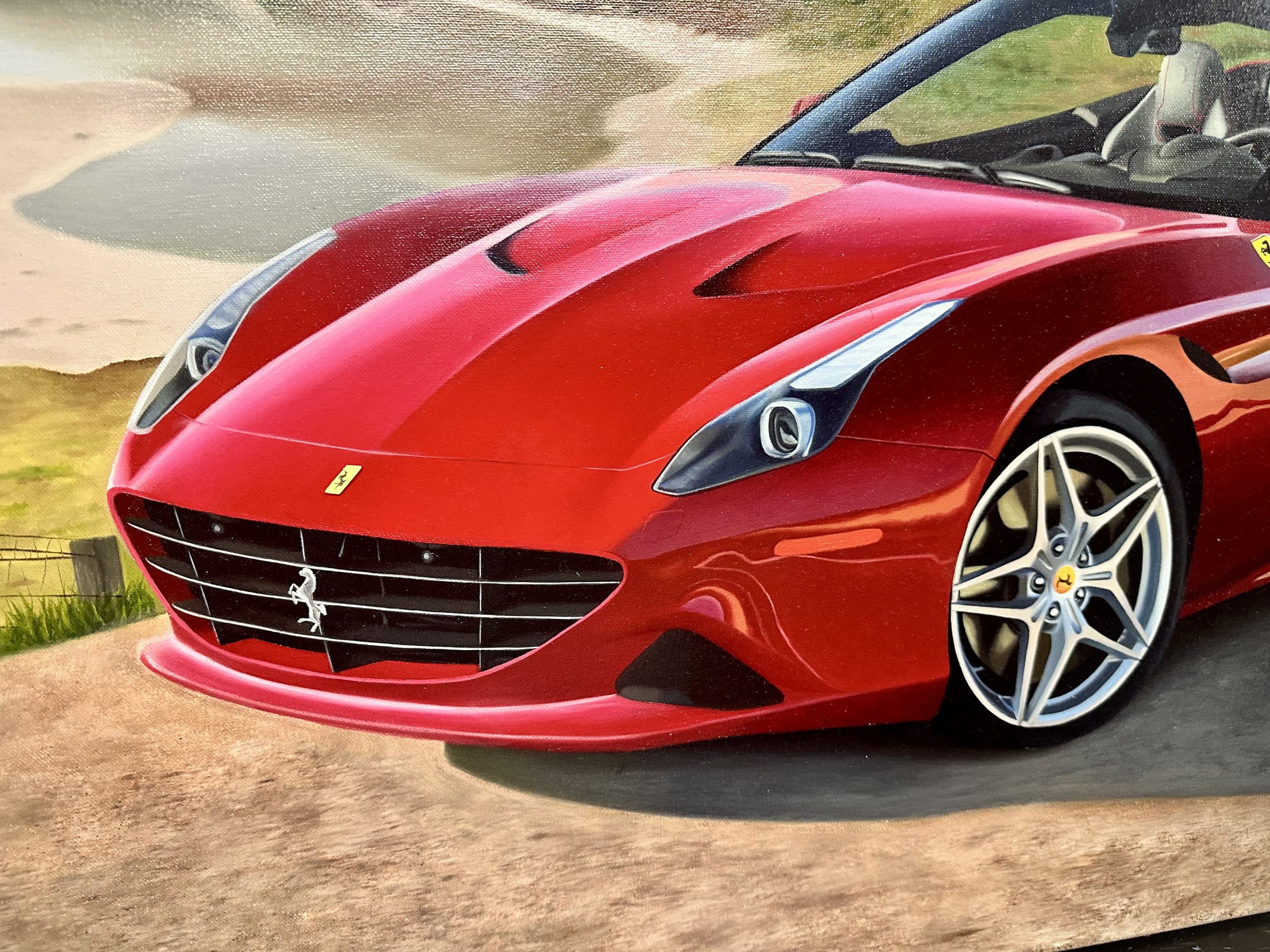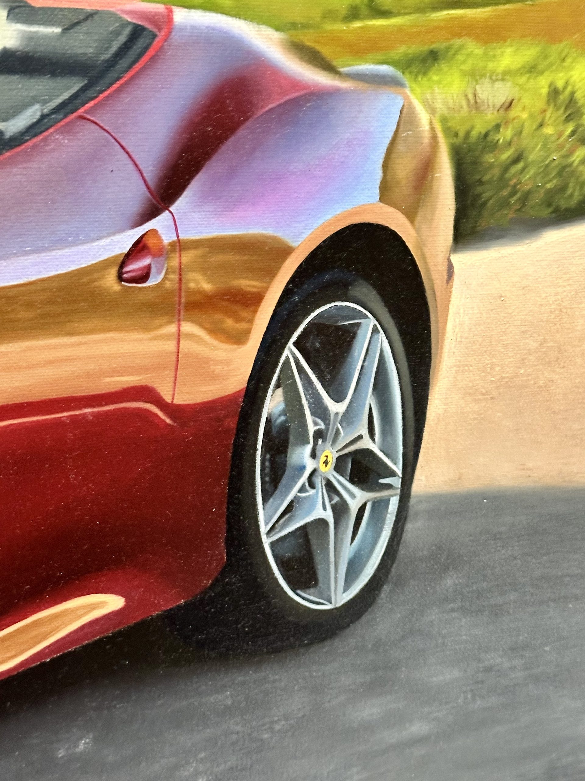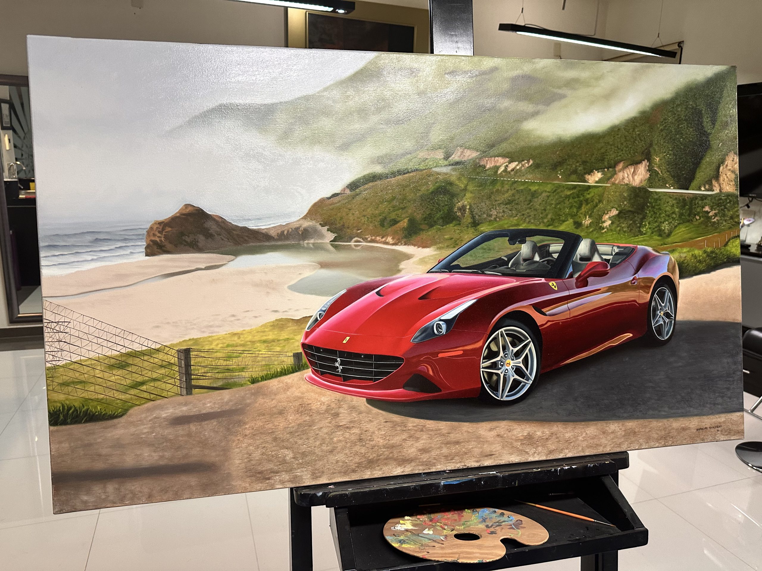 Para concluir, esta pieza se establece como un testimonio visual de indudable mérito estético, donde el maestro Sergio Gonzalez valida su capacidad para capturar la esencia emocional de la ingeniería italiana. La pintura logra transformar un objeto de consumo en una escultura atemporal, celebrando la fusión entre el rendimiento y el estilo. Es una obra que seduce por su acabado impecable y su atmósfera de exclusividad, reafirmando al automóvil como un sujeto digno de la más alta tradición pictórica realista.