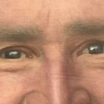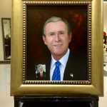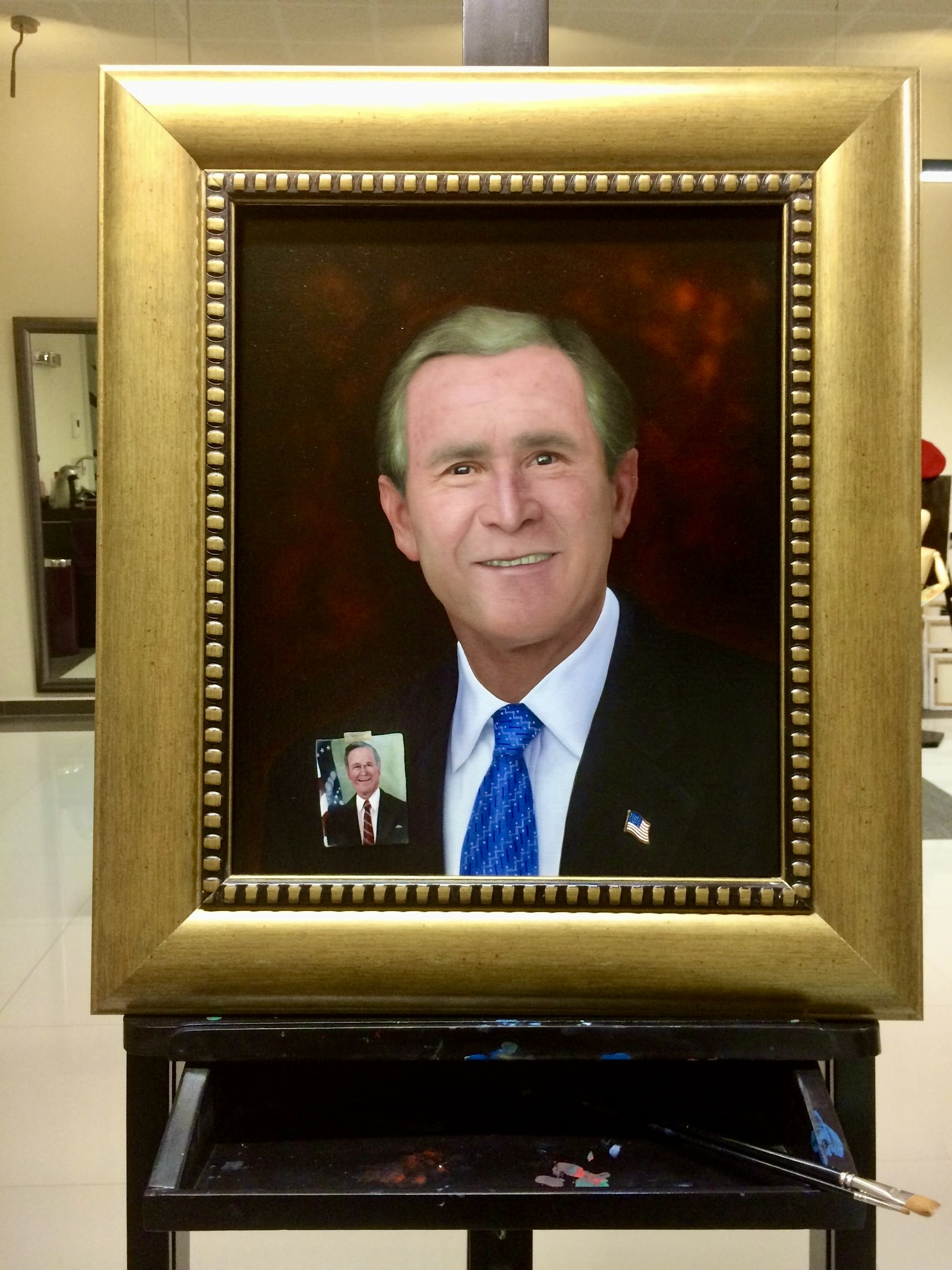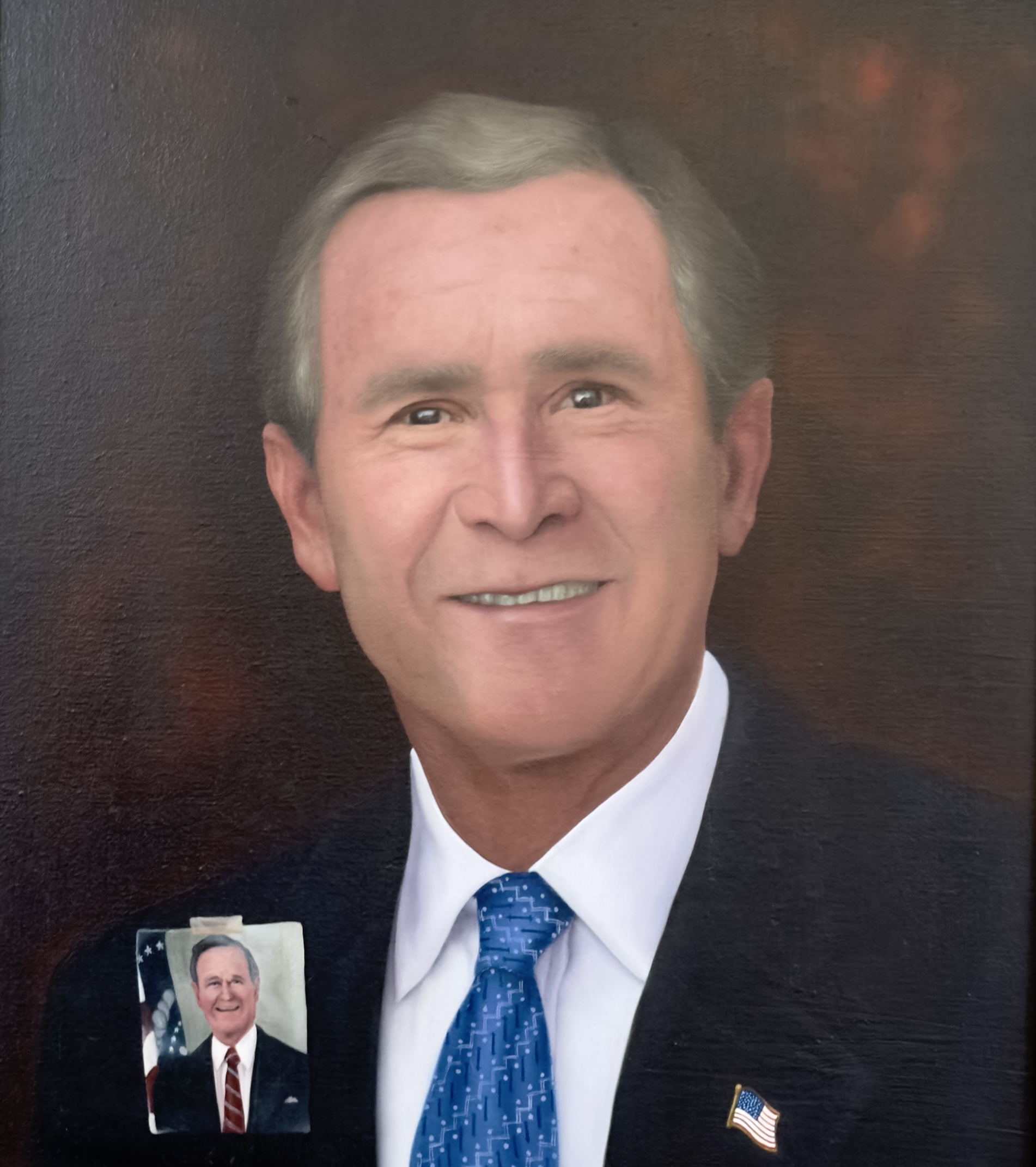 George W. Bush y su padre en foto pegada (es parte de la pintura), además la bandera de E.U.A reflejada en sus pupilas, Ex Presidentes de E.U.A.