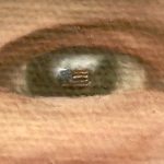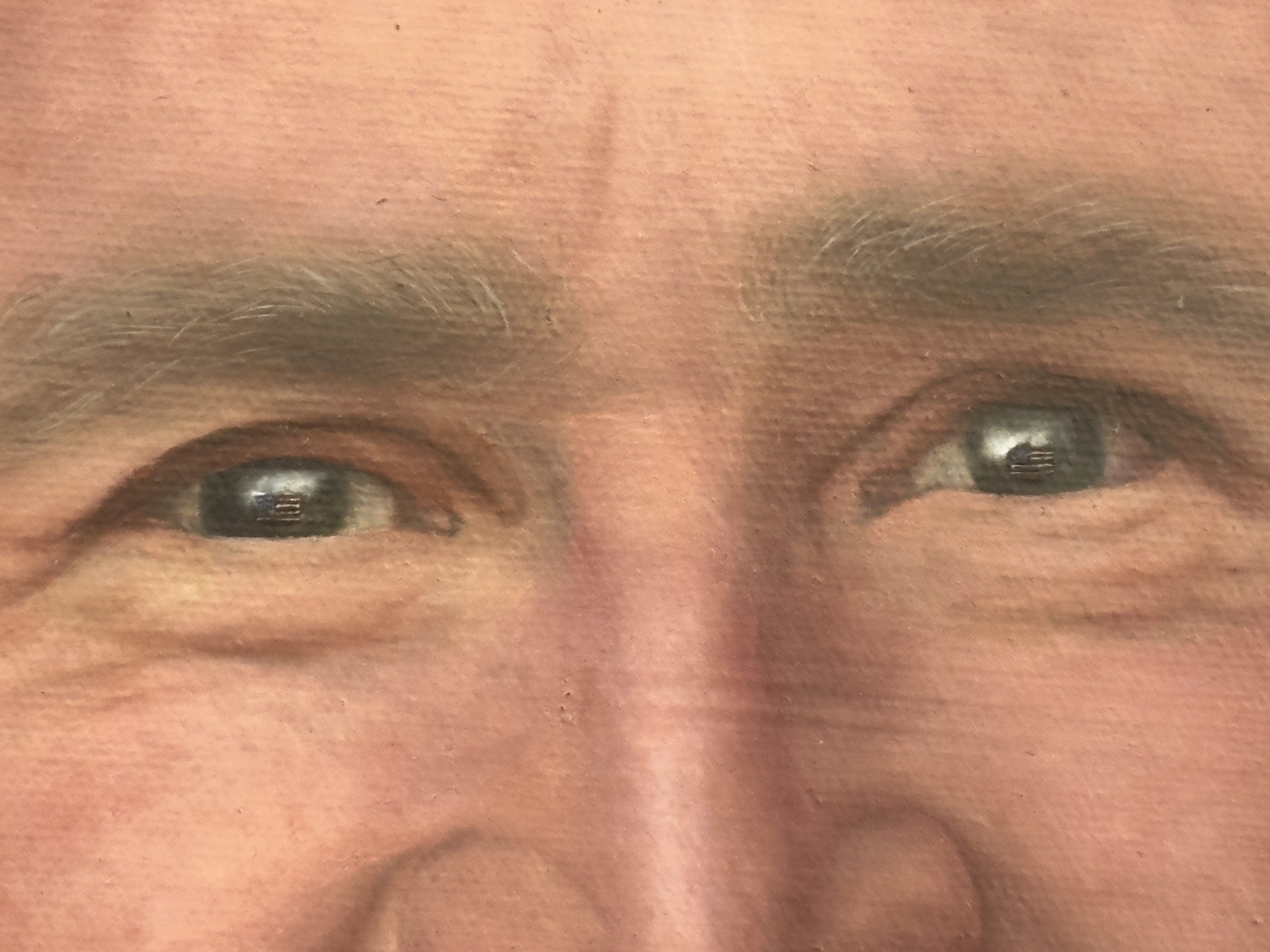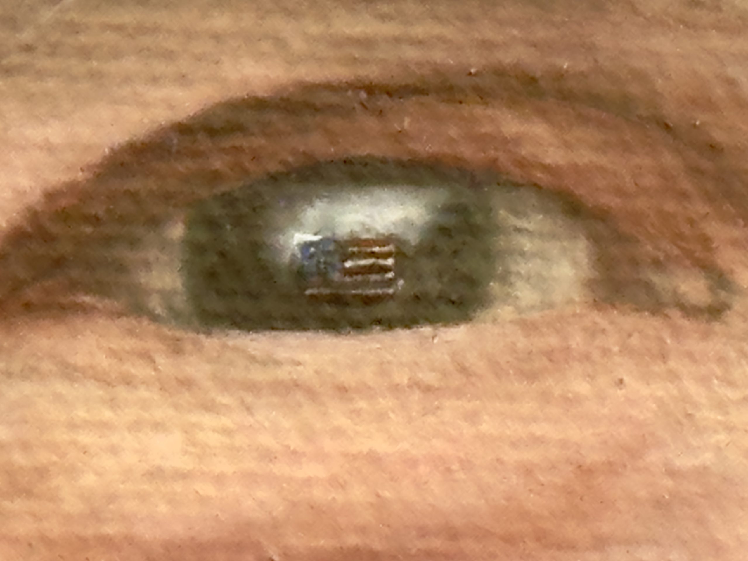 En el plano psicológico y simbólico, el retrato profundiza en la carga del legado. La expresión de George W. Bush es de una seriedad resuelta, pero lo que define verdaderamente la lectura de la obra es el detalle microscópico en su mirada: en sus pupilas ondea el reflejo de la bandera de los Estados Unidos. Este elemento, sumado a la presencia de la foto paterna, sugiere que su visión y su identidad están indisolublemente ligadas al deber patriótico y a la continuidad dinástica. Es una mirada que no solo observa el presente, sino que porta consigo la historia de la nación y el peso del apellido.