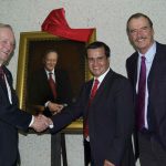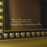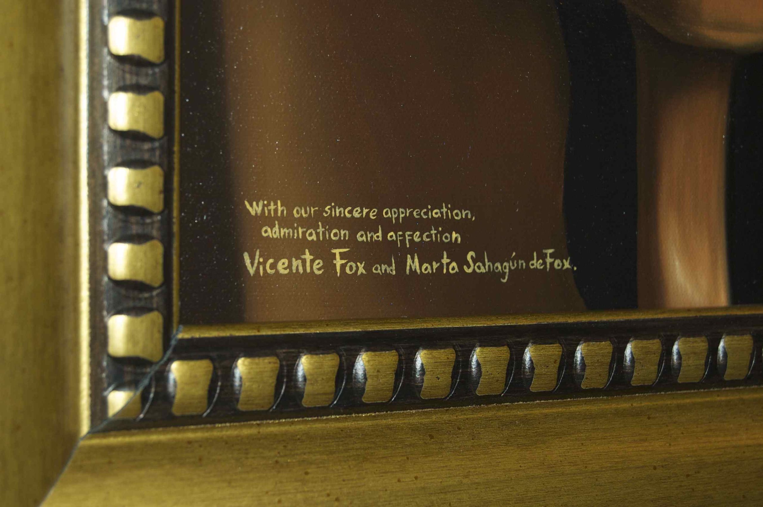 La estructura visual de la pieza apuesta por una composición sedente que transmite estabilidad y apertura al diálogo. La paleta cromática se mantiene sobria y elegante, con el traje oscuro sirviendo de marco para que la corbata roja con patrón de puntos —un guiño de color y vitalidad— capture la atención central. González demuestra una atención minuciosa a los detalles tangibles: desde el realismo de las manos entrelazadas, donde se adivina la estructura ósea y las venas, hasta el brillo metálico del reloj de pulsera. Un elemento distintivo de esta composición es la inscripción visible en la esquina inferior izquierda, una dedicatoria firmada por Vicente Fox y Marta Sahagún, que integra la historia de la amistad bilateral directamente en la superficie pictórica.