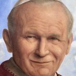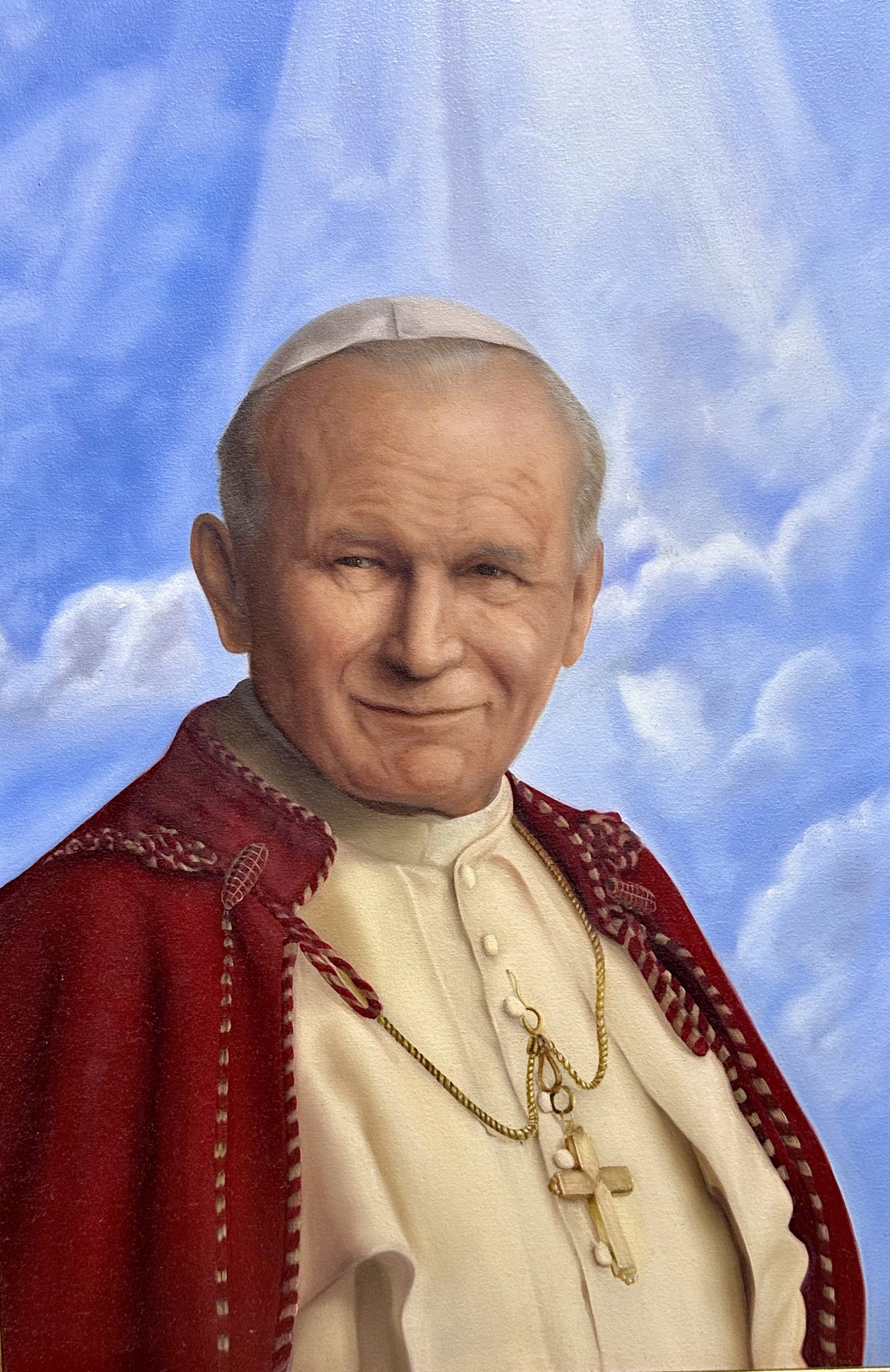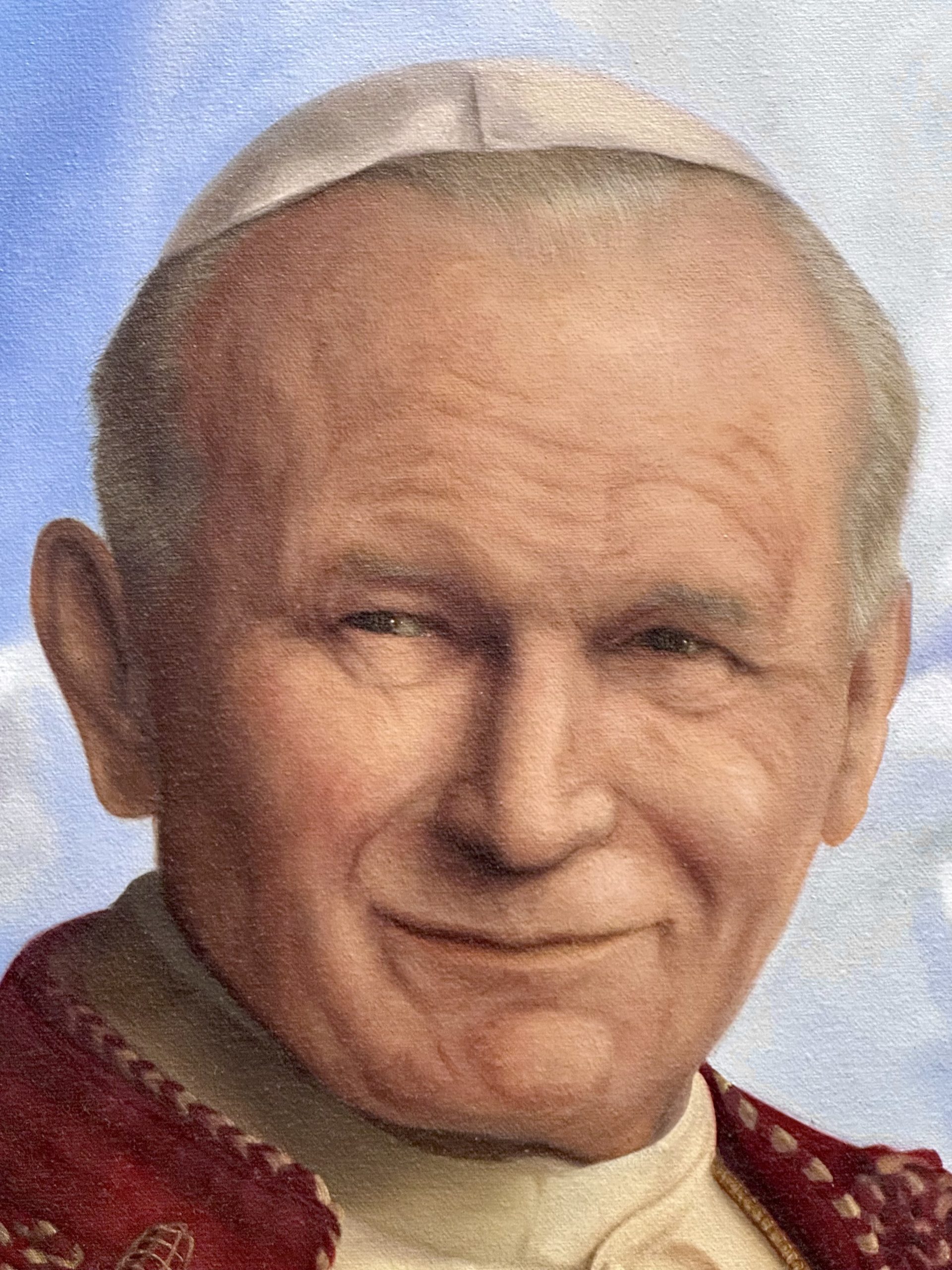 Esta pintura es un retrato al óleo de Sergio González que representa al Papa Juan Pablo II con un alto grado de realismo y detalle.