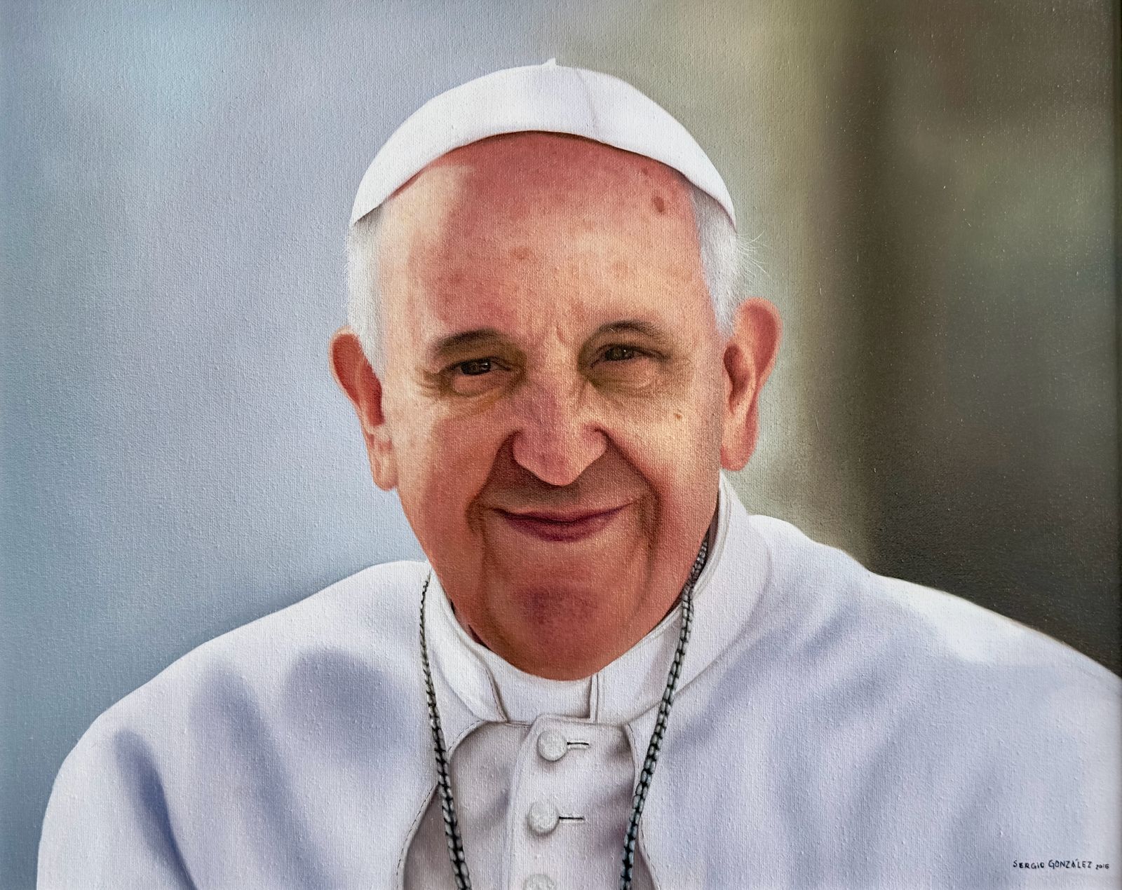 Con una humanidad desbordante que trasciende el lienzo, este retrato del Papa Francisco, firmado por el maestro Sergio González, se erige como un monumento a la humildad y la cercanía pastoral. La obra aborda la figura del Pontífice argentino con un realismo conmovedor, despojándolo de la pompa jerárquica para centrarse en la calidez del hombre; la luz, tratada con una suavidad envolvente, recorre la geografía facial con respeto, iluminando las marcas de la edad y la sonrisa afable que se han convertido en su sello distintivo. La pincelada no busca la perfección pulida del mármol, sino la textura orgánica de la vida, logrando que la piel transmita una sensación de temperatura y bondad tangible.