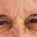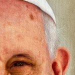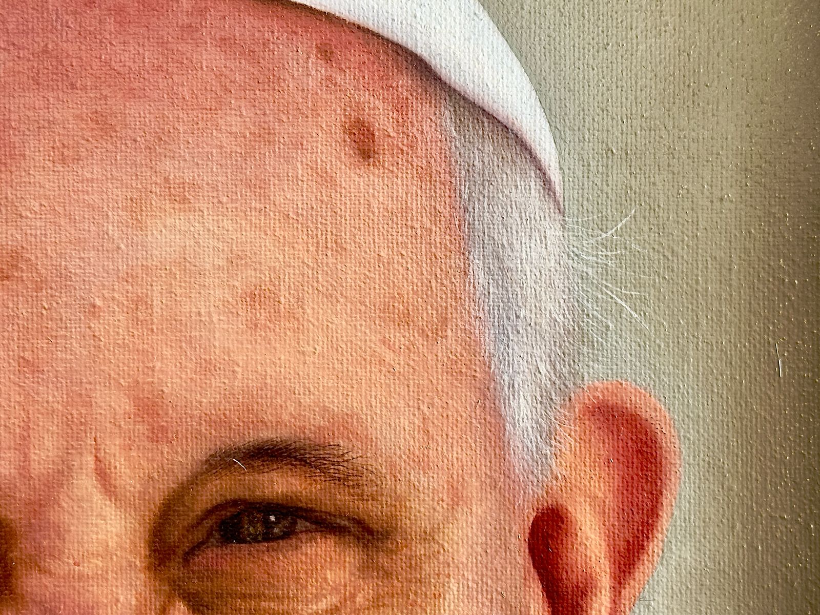 En el corazón de la dimensión psicológica y simbólica, el cuadro revela su secreto más precioso: la devoción mariana que define el pontificado de Jorge Mario Bergoglio. La expresión, de una serenidad alegre y compasiva, adquiere una profundidad teológica al descubrirse que, en la curvatura cristalina de sus pupilas, habita el reflejo nítido de la Virgen de Guadalupe. Este detalle de miniaturismo virtuoso no es solo un alarde técnico; es una declaración de identidad que vincula al primer Papa latinoamericano con la «Emperatriz de América». El artista sugiere visualmente que la mirada de Francisco hacia el mundo está mediada y protegida por la imagen de la Guadalupana, fusionando la fe universal con sus raíces continentales.