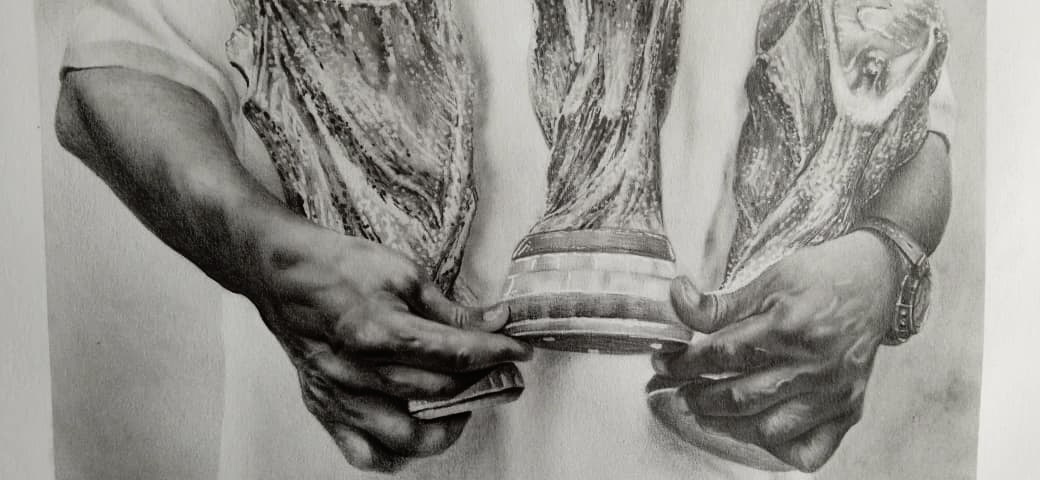 La composición de la pieza es de una armonía y equilibrio envidiables, situando a Pelé como el eje central de una narrativa de gloria, flanqueado por los tres trofeos que simbolizan su gesta histórica. Es en la riqueza de las texturas donde la pincelada de grafito de Gonzalez alcanza su mayor esplendor: la porosidad de la piel, la suavidad del vello y la nitidez de la sonrisa contrastan magistralmente con el brillo metálico y las superficies labradas de las copas. El uso de una paleta de grises profundamente rica permite una cohesión visual absoluta, donde el fondo etéreo concentra toda la fuerza narrativa en la figura y sus atributos de victoria, logrando una unidad estética impecable.